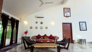 The living room-cum-dining room is tastefully decorated with state-of-the-art sofas, a large dining table and three split air conditioners. A sixty-five inch LED TV with a Tata Sky connection is provided for your viewing pleasure.
